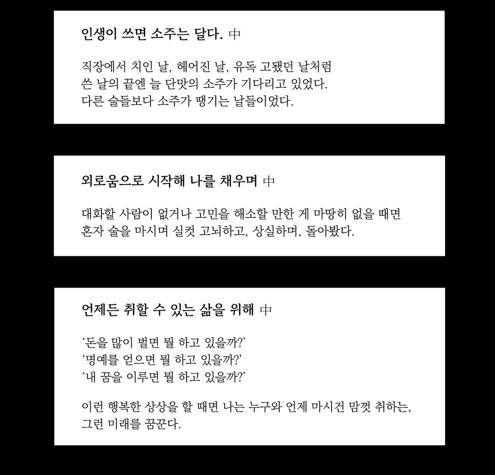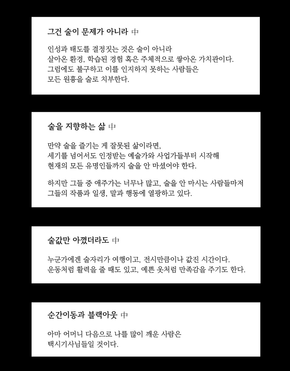 술과 함께한 모든 순간들을 술을 좋아하는 사람의 입장으로 써내려갔습니다.